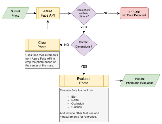 Simple flow chart describing the process once an image is submitted. The goal is the process to end with a properly size image and metadata to quickly determine if the picture will pass muster with the passport office.